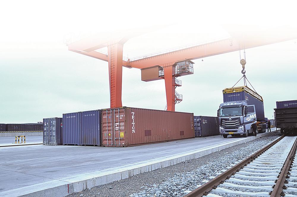 鹽城北站貨場組織吊裝農(nóng)副產(chǎn)品準(zhǔn)備上專列。 記者 黃海峰 攝