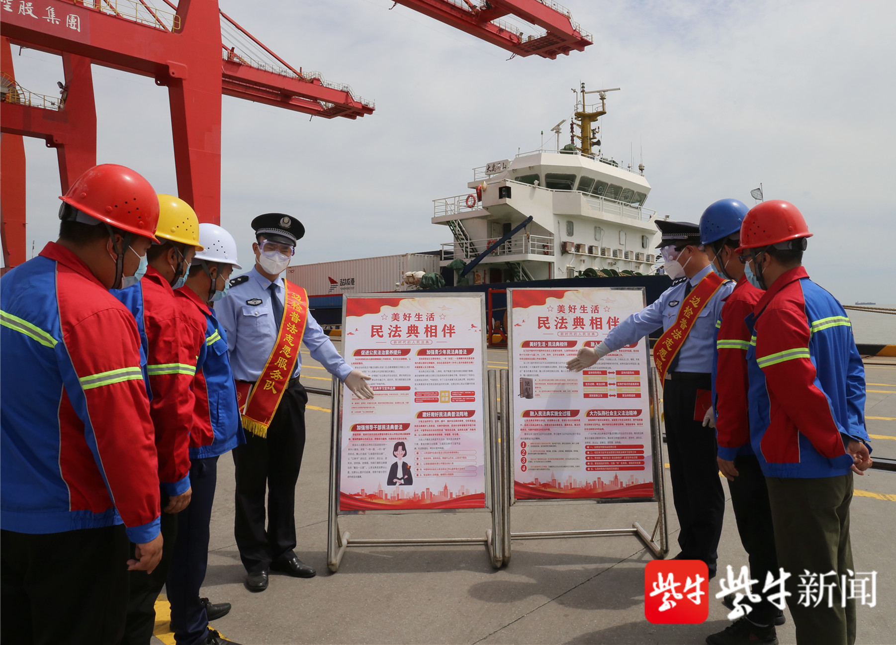 邊檢民警與碼頭工人一起現場學習《民法典》