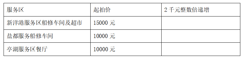 競拍形式:公開競拍,拍租期限為1年,每個(gè)服務(wù)區(qū)的競拍按起拍價(jià),2千元整數(shù)倍遞增(如2000、4000、6000、8000……)。如下表: