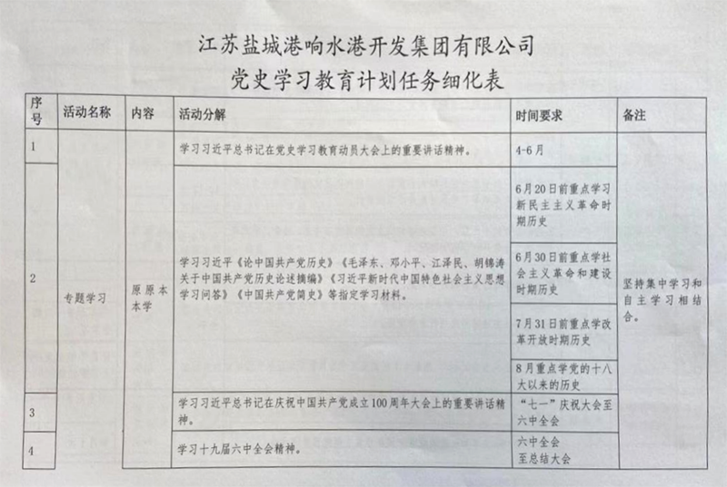 5月29日,響水港區在集中學習會上傳達學習了《響水港黨史學習教育計劃任務細化表》,向全體黨員和員工講知了細化任務。圍繞指定四本學習書籍,分期分段學習,做到有學習、有研討、有發言、有體會,讓黨史學習教育往深里走、往實里走,促使黨員干部進一步增強“四個意識”,堅定“四個自信”,做到“兩個維護”。