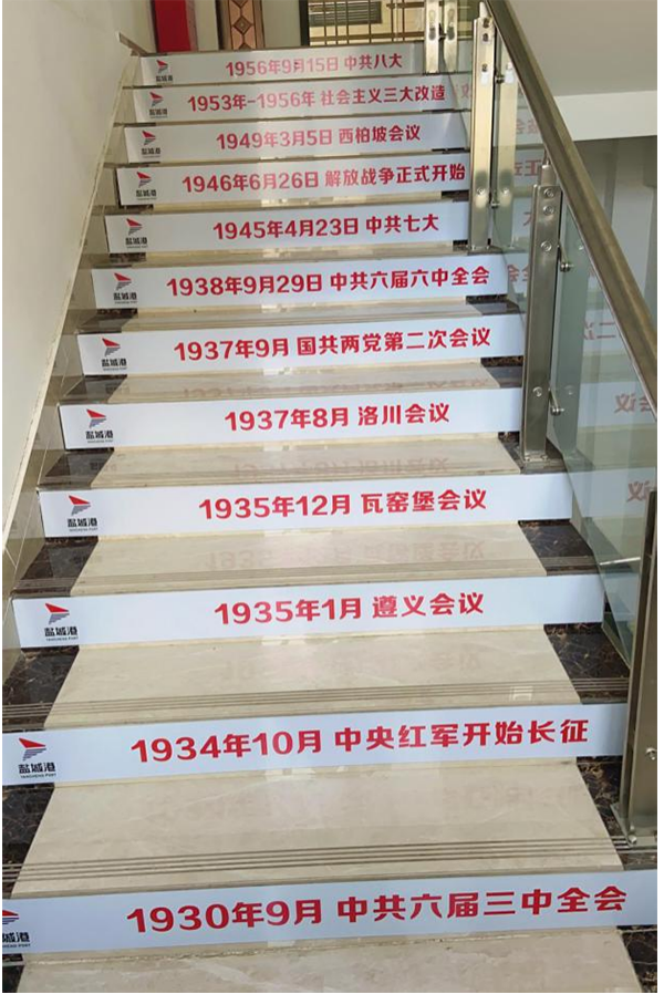 針對廣大干部職工工作實際,響水港區精心設計,細心研究,將學習形式和載體不斷創新。近日,響水港區創新打造“樓梯課堂”,將黨史發展時間歷程貼印在樓梯上,方便大家在上班閑暇時,無形地將黨史知識學進腦子里?!皹翘菡n堂”的每一個階梯同時也代表著黨的每一個發展歷程,一步一臺階,扎扎實實譜新篇。響水港區員工普遍反映這個學習方式有創意有實效,鞏固加深了他們對黨史的掌握程度,也提高了他們學習黨史的興趣。
