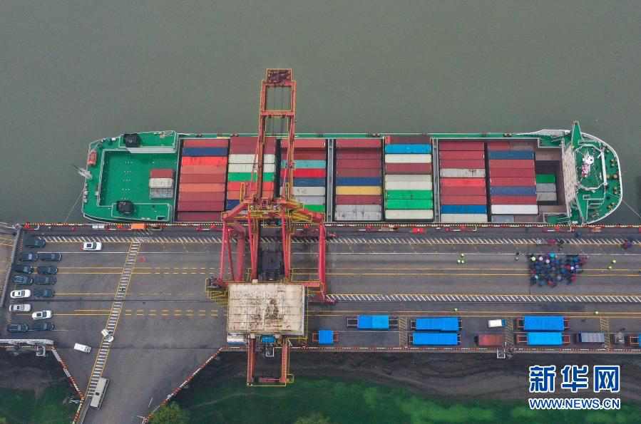 2月28日,停靠在碼頭的“漢海5號”準備首航駛往上海洋山港(無人機照片)。新華社發(趙軍 攝)