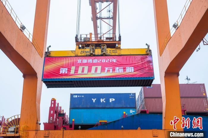 圖為2021年廣西北部灣港集裝箱第100萬個標箱吊裝上船。 楊煜航 攝