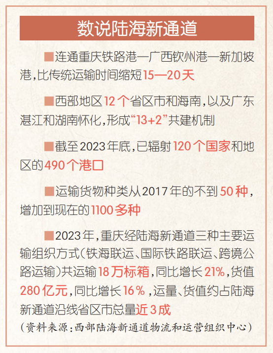 數(shù)據(jù)顯示,2023年,重慶經(jīng)陸海新通道三種主要運(yùn)輸組織方式(鐵海聯(lián)運(yùn)、國(guó)際鐵路聯(lián)運(yùn)、跨境公路運(yùn)輸)共運(yùn)輸18萬(wàn)標(biāo)箱,同比增長(zhǎng)21%,貨值280億元,同比增長(zhǎng)16%,運(yùn)量、貨值約占陸海新通道沿線(xiàn)省區(qū)市總量近3成。