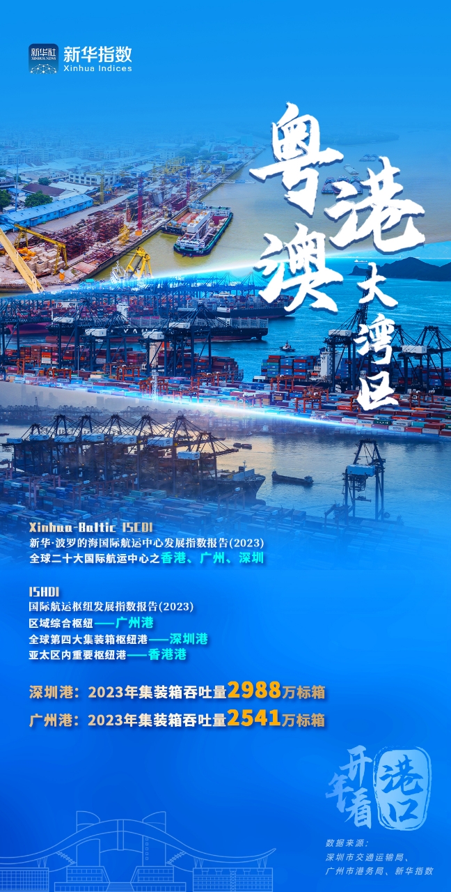 從2022年起,廣州港、深圳港、珠海港、東莞港4個港口就成功晉級億噸大港行列。在中國經濟信息社聯合波羅的海交易所發布的《新華·波羅的海國際航運中心發展指數報告(2023)》中,香港、廣州、深圳躋身全球二十大國際航運中心之列。在《國際航運樞紐發展指數報告(2023)》中,深圳港被評為全球第四大集裝箱樞紐港;香港港被評為亞太區內重要樞紐港;廣州港被評為區域綜合樞紐港。