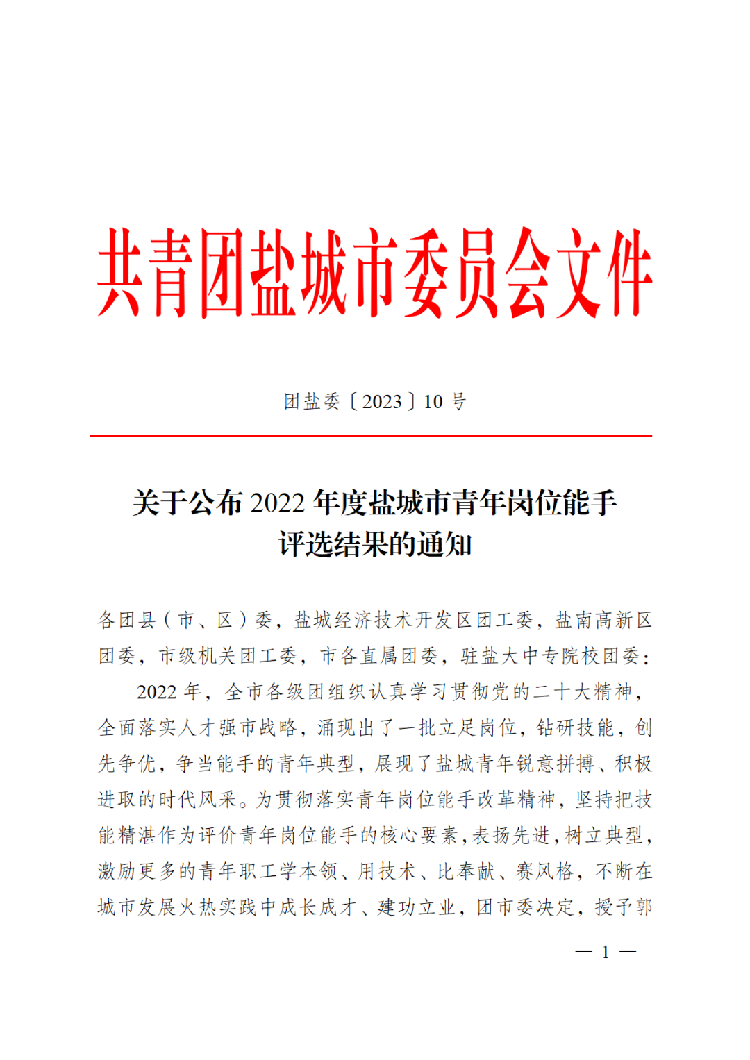 近日,共青團鹽城市委發布《關于公布2022年度鹽城市青年崗位能手評選結果的通知》,集團丁浩明、龔海衛、李睿三名青年同志榮獲“2022年度鹽城市青年崗位能手”稱號。