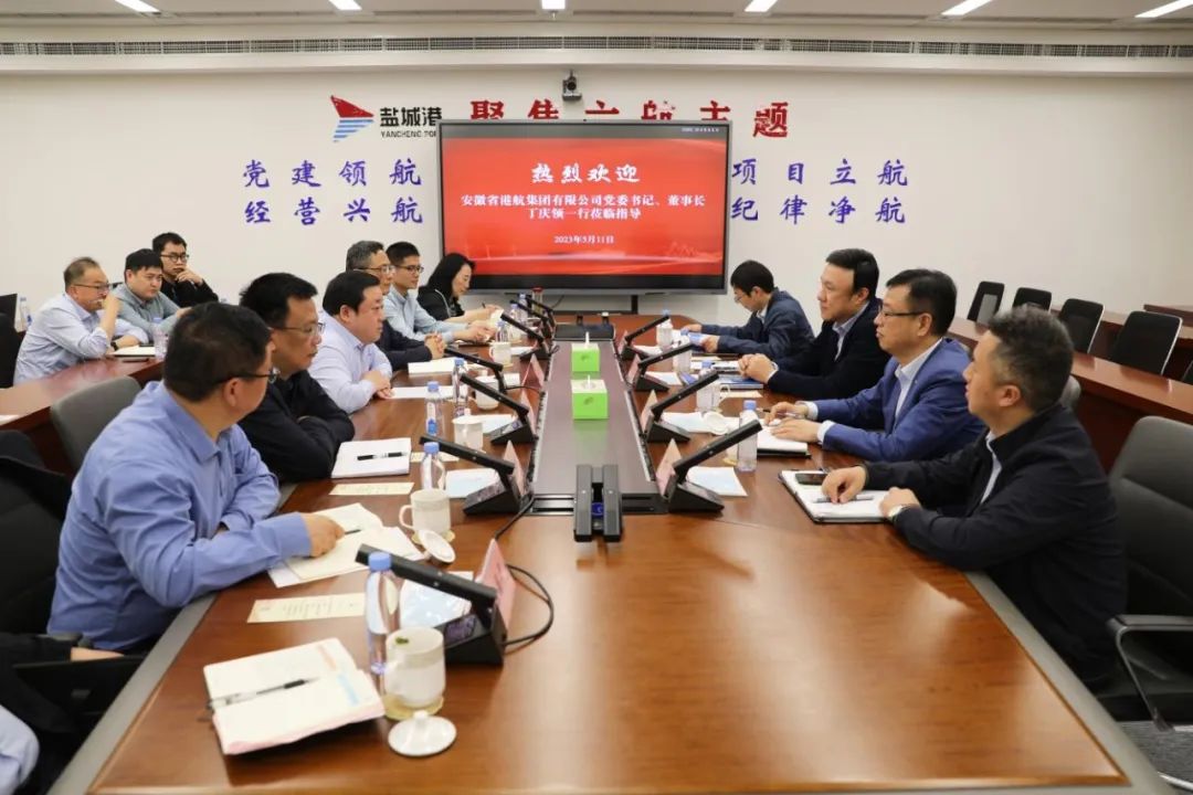 5月11日,安徽省港航集團(tuán)黨委書記、董事長丁慶領(lǐng)率隊(duì)來我集團(tuán)調(diào)研,集團(tuán)黨委書記、董事長周正雄接待丁慶領(lǐng)一行。安徽港航物流公司董事長、總經(jīng)理,徽航瑞國際滾裝公司董事長張文付,鹽城港集團(tuán)黨委副書記、董事、總經(jīng)理陸帥,鹽城港集團(tuán)黨委委員、副總經(jīng)理夏立新、徐振山、梁洪兵,鹽城港集團(tuán)副總經(jīng)理袁欣,安徽省港航集團(tuán)相關(guān)部門負(fù)責(zé)同志等參加。