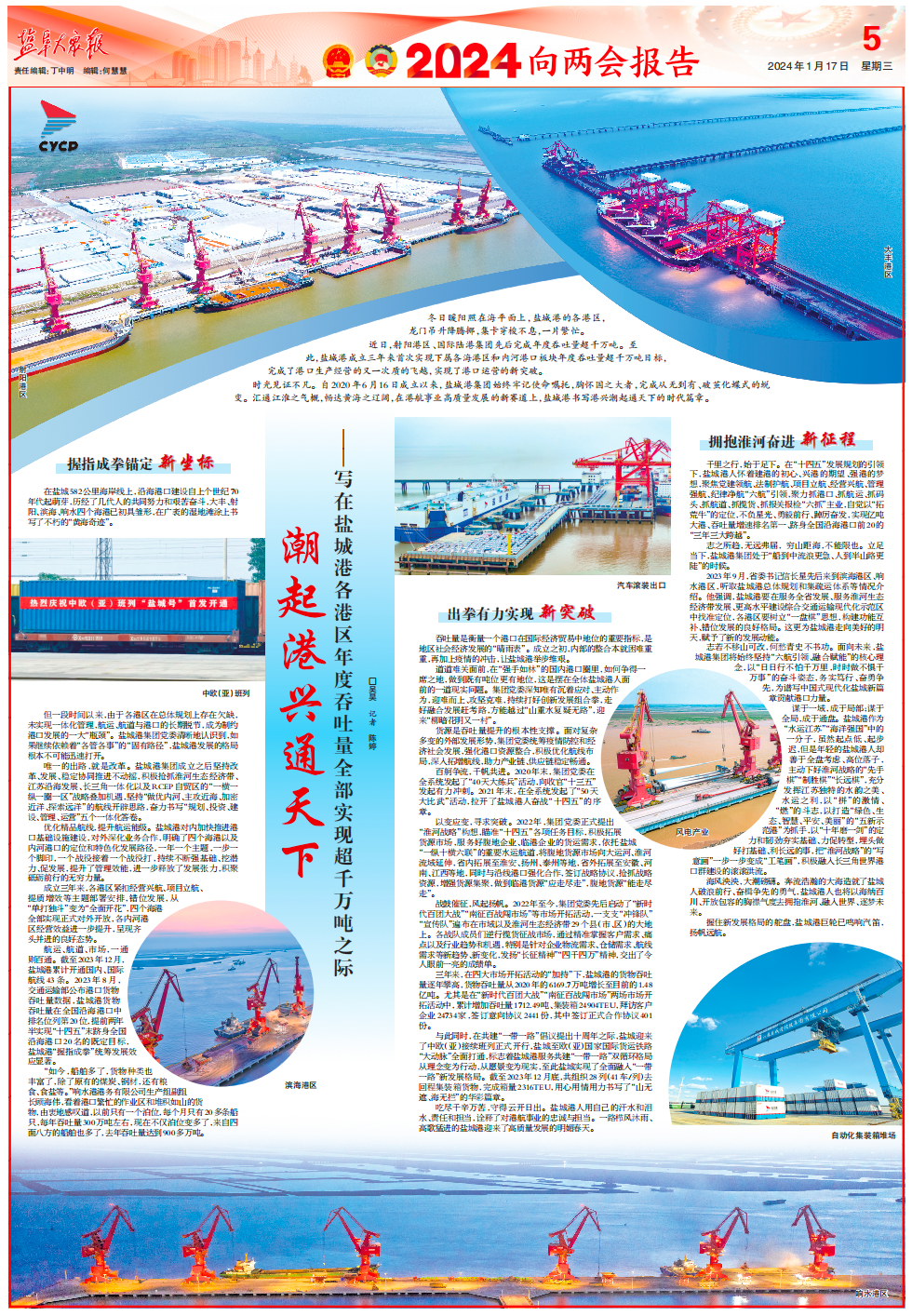 2023年9月,省委書記信長星先后來到濱海港區、響水港區,聽取鹽城港總體規劃和集疏運體系等情況介紹。他強調,鹽城港要在服務全省發展、服務淮河生態經濟帶發展、更高水平建設綜合交通運輸現代化示范區中找準定位,各港區要樹立“一盤棋”思想,構建功能互補、錯位發展的良好格局。這更為鹽城港走向美好的明天,賦予了新的發展動能。