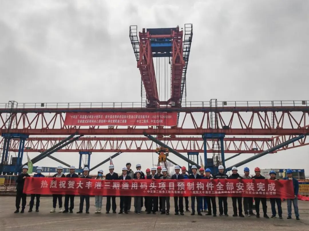 隨著最后一榀預制面板在智能筑港機的精準操控下平穩就位,鹽城港大豐港區三期通用碼頭3號泊位項目圓滿完成全部預制構件安裝任務。這一重要節點不僅標志著碼頭主體工程建設進入最后沖刺階段,更意味著由項目建設、設計、施工等參建各方聯合中國海洋大學,依托國家重點研發計劃開展的核心技術攻關,為該項目量身打造的“智能積木拼裝師”——全球首創裝配式碼頭一體化綠色智能筑港機成功完成示范應用。