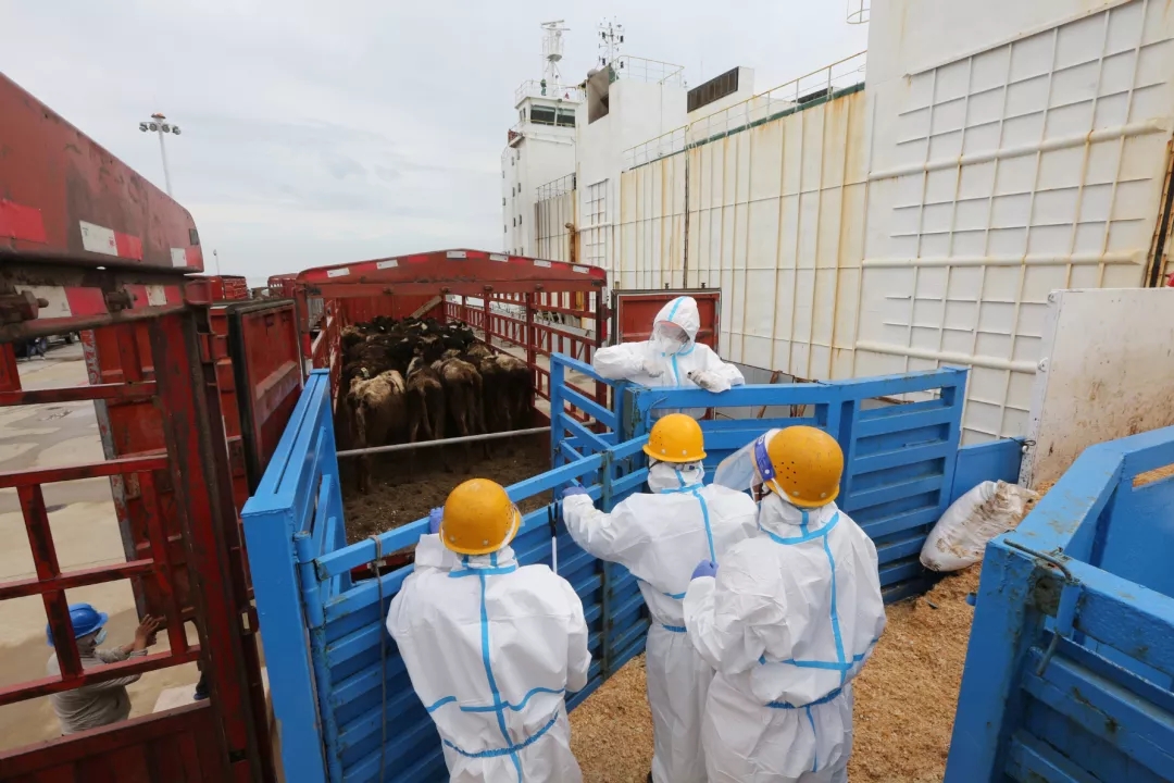 早在船舶抵港前一周,鹽城港船舶代理公司便聯(lián)系各方召開了船前會,部署安排各項準(zhǔn)備工作,及時向船方通報相關(guān)要求,同時密切關(guān)注航行動態(tài)以及活牛健康狀況。到港前,正值強對流天氣多發(fā)季節(jié),碼頭人員密切關(guān)注天氣狀況,天氣一經(jīng)轉(zhuǎn)好便聯(lián)系引水拖輪,搶抓窗口期安排船舶進(jìn)港,同時提前安排轉(zhuǎn)運車輛消殺進(jìn)港,船舶靠港后,碼頭工作人員認(rèn)真組織防疫、消殺工作,在最短時間內(nèi)完成聯(lián)檢工作,為活牛卸船爭取了時間。