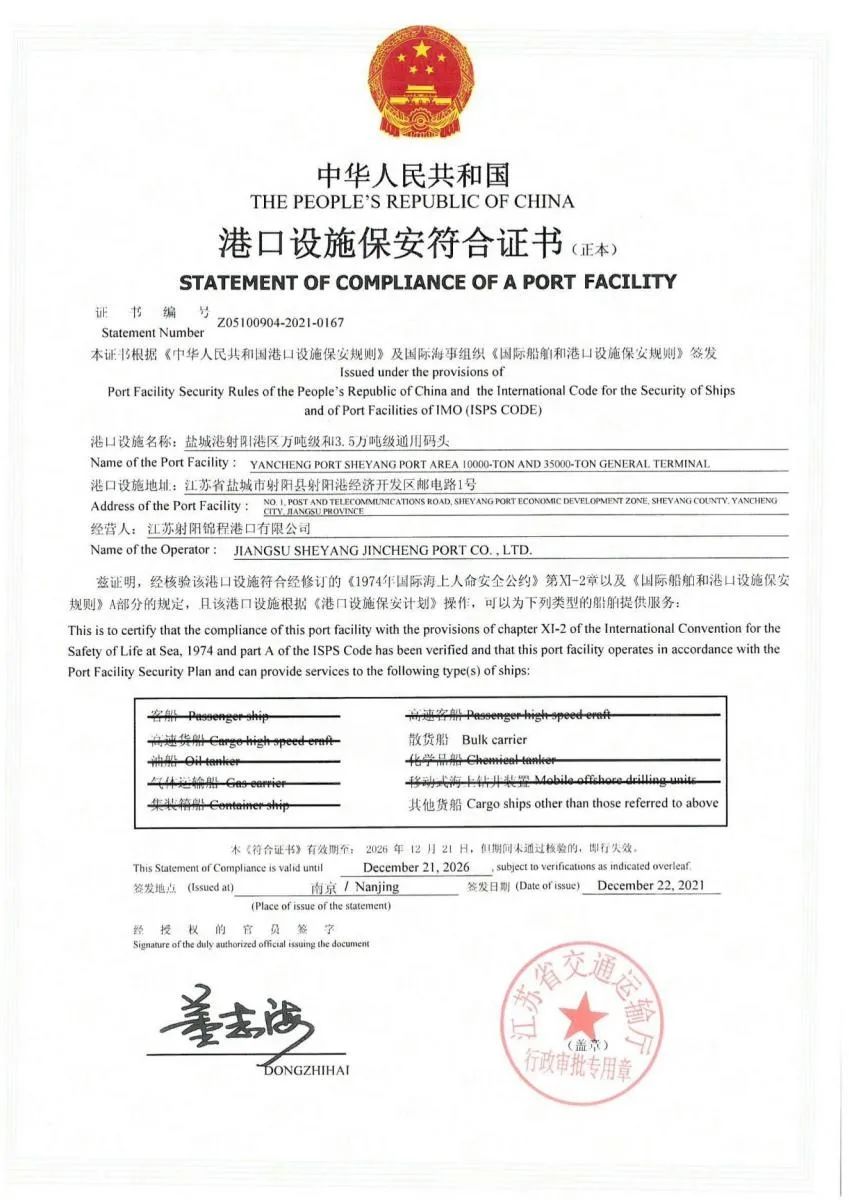 12月21日,經(jīng)過射陽港區(qū)項(xiàng)目條線人員近三個(gè)月的不懈努力,在各主管部門和專業(yè)咨詢單位的支持配合下,鹽城港射陽港區(qū)順利取得江蘇省交通運(yùn)輸廳核發(fā)的港口設(shè)施保安符合證書,這一證書的成功獲批,為射陽港區(qū)一類開放口岸國家級驗(yàn)收奠定了堅(jiān)實(shí)基礎(chǔ)。