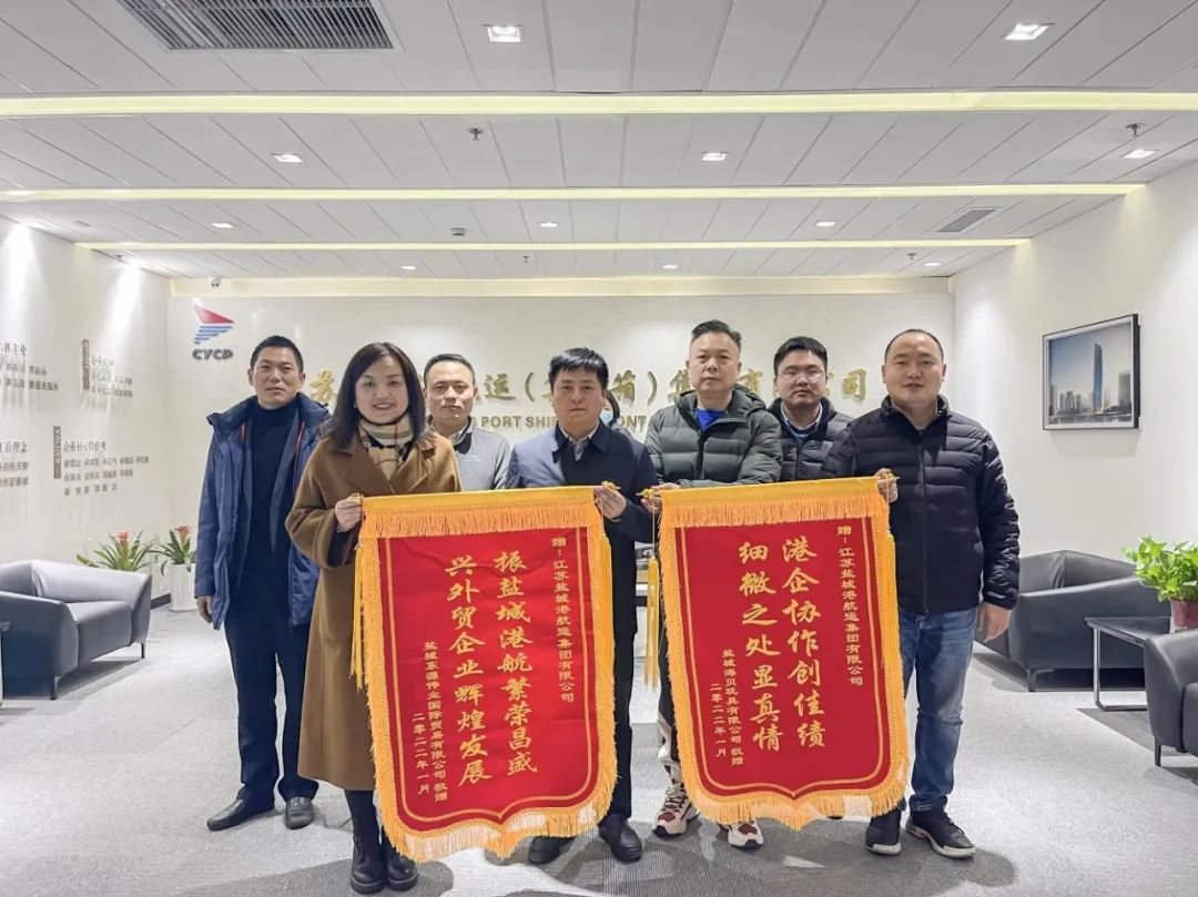1月25日,農(nóng)歷小年這一天,南京海聆夢(mèng)、鹽城東源偉業(yè)和鹽城海貝玩具三家公司不約而同來到鹽城港航運(yùn)集團(tuán),分別將寫有“高效服務(wù)心系企業(yè)”、“振鹽城港航繁榮昌盛,興外貿(mào)企業(yè)輝煌發(fā)展”、“港企協(xié)作創(chuàng)佳績,細(xì)微之處顯真情”的錦旗送到了公司班子手中,感謝航運(yùn)集團(tuán)一年來在貨物出運(yùn)上給予的大力支持。