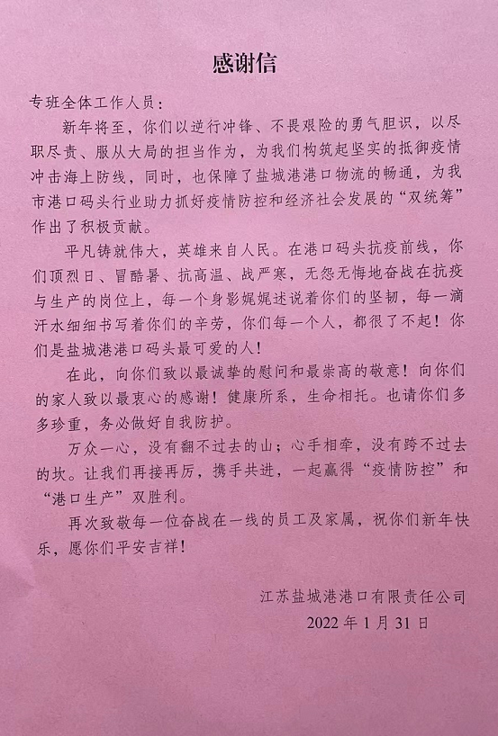 農歷大年三十,鹽城港大豐港區港口公司為外貿專班集中居住人員送去感謝信,過年期間通過加餐、點亮隔離酒店的燈光等形式,進一步造濃節日氣氛。