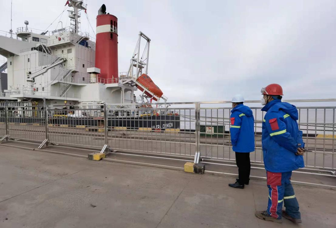 農歷正月初二,外貿板材船“奧姆斯基115”停泊在糧食碼頭分公司6#泊位,碼頭作業人員嚴格執行“內外分開”要求開始裝卸作業。