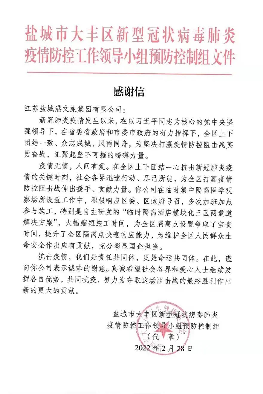 3月1日,大豐區疫情防控工作領導小組向鹽城港文旅集團發來感謝信,對文旅集團在設置隔疫情隔離點工作中,自主研發“臨時集中隔離醫學觀察場所模塊化‘三區’解決方案”,提升全區隔離點快速響應能力所作出的貢獻表示感謝。