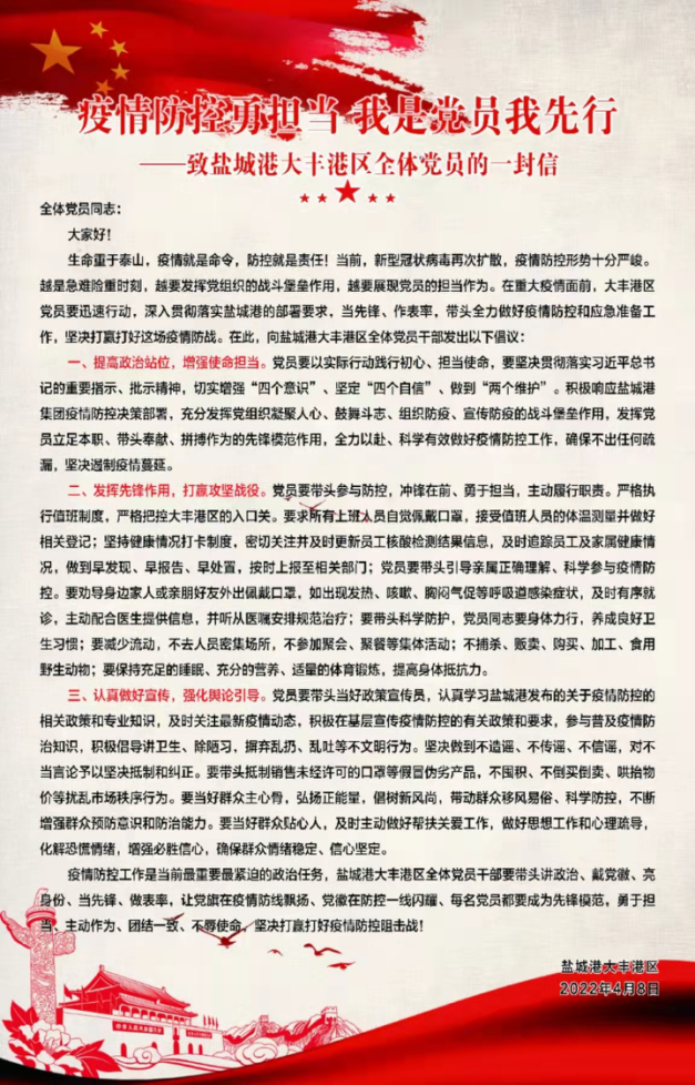 疫情就是命令,防控就是責任。面對來勢洶洶的疫情,集團黨委下發了《關于在常態化疫情防控中充分發揮黨組織和黨員先鋒模范作用的通知》,接到命令后,鹽城港大豐港區堅決將集團疫情防控的決策部署落到實處,周密部署、快速行動,給各基層黨組織送去《致全體黨員的一封信》,倡導廣大黨員干部、職工群眾積極應對、全員戰“疫”,各子(控)公司紛紛行動,使群防群控、聯防聯控的“一盤棋”全面落子布局,筑牢織密疫情防控防線。