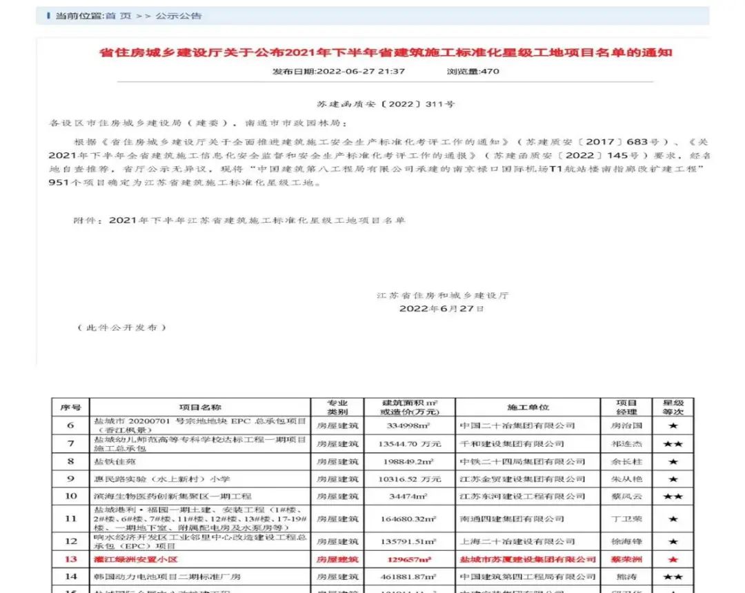 近日,鹽城港集團(tuán)灌江綠洲安置小區(qū)項(xiàng)目在榮獲“鹽城市建筑施工標(biāo)準(zhǔn)化示范工地”稱號后,再次榮獲“2021年下半年江蘇省建筑施工標(biāo)準(zhǔn)化星級工地”稱號。