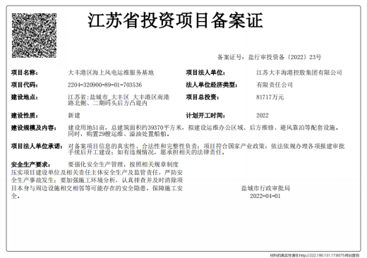 鹽城港大豐港區海上風電運維服務基地項目為市城鄉建設重點房建項目之一,位于大豐港區南港路北側、物聯大廈東側,二期碼頭后方凸堤內,建設用地51畝,建筑面積約39370㎡,項目總投資81717萬元,擬建設運維辦公區、維修車間、安全培訓中心等,后期部分建設避風靠泊等配套設施;同時購置29艘運維、溢油處置船舶,通過建立運維基地,統一運維,打造專業運維隊伍,共享運維配套資源及數據,降低鹽城地區各個海上風電的運維成本,促進海上風電高效運行,帶動風電產業鏈的發展。