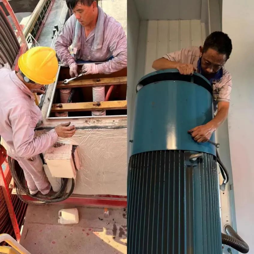 天氣炎熱,設(shè)備也常“中暑”。“2#門機出現(xiàn)分波過熱故障,門機跳電了”,早上7點,剛到港的修理電工大宋就接到前方司機的報修指令。大宋隨即和同伴趕到現(xiàn)場,經(jīng)過排查,發(fā)現(xiàn)是左旋電機風(fēng)機損壞。經(jīng)過2個多小時的搶修,設(shè)備再次順利投入使用。搶修人員剛下門機還沒來得及喝口涼水,對講機里又傳來了1#門機整機跳電故障報修。經(jīng)檢查判定這是一起因電纜滑環(huán)內(nèi)外溫差導(dǎo)致設(shè)備內(nèi)部有水凝造成的設(shè)備故障。此時戶外的溫度已達(dá)35℃,而門機機房經(jīng)過陽光的烘烤已近40℃,搶修人員卻毫不遲疑,立即投入搶修工作......
