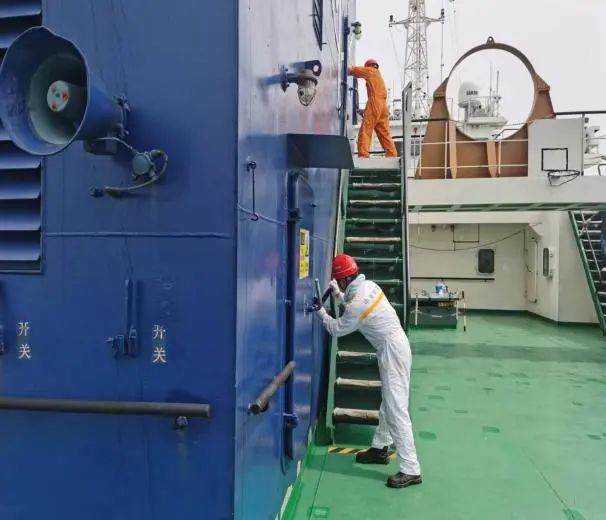 隨后,溢油演習正式開始,“左舷船中錨機壓管漏油啦!”“新海鯉”輪船長接報后立即拉響了防油污警報,同時船長通過全船廣播告知溢油地點,根據應變部署要求,立即切斷漏油源頭,控制油污流入海面,清理甲板現場污油。同時上報施工項目部,項目部組織“航工301”、“茸洋168”、“海盛189”輪立即趕赴灌河口航道轉運點參與新海鯉輪的水面油污清理工作,通過各輪齊心協作,成功完成清污工作。