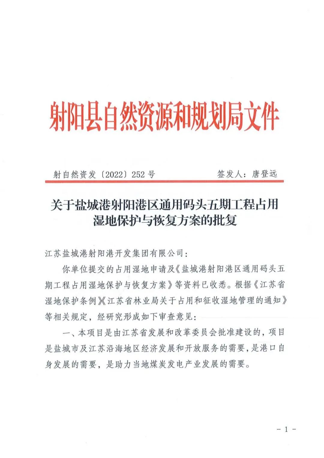 鹽城港射陽港區通用碼頭五期工程占用濕地保護和恢復方案正式獲批