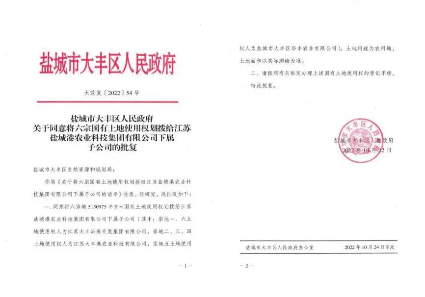 農業科技集團成立辦證工作小組,專項推進辦證工作,積極主動對接大豐區政府、港區管委會屬地政府及市自然資源和規劃局、上海農場、鹽業公司等四址相鄰單位,協調屬地政府批復、四址確認等權證辦理手續,確保權證辦理工作有力有序推進。