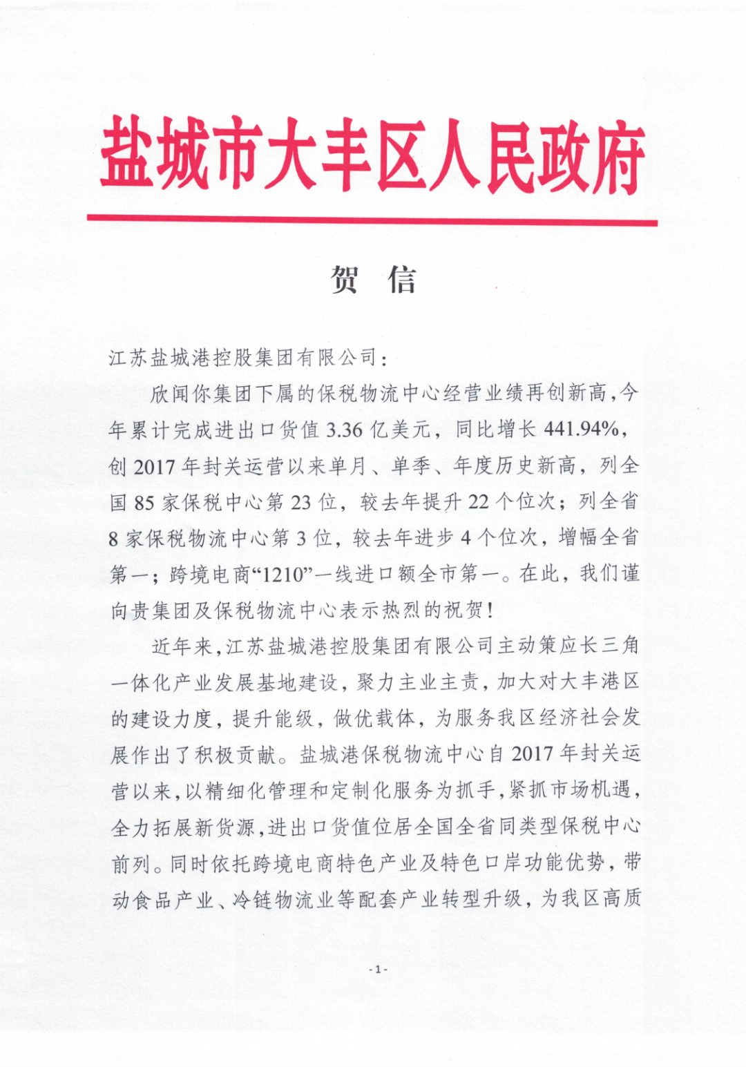 12月16日,大豐區人民政府向我集團發來賀信,對我集團下屬保稅物流中心經營業績再創新高表示祝賀。