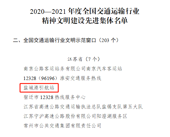 鹽城港引航站榮登2020-0201“全國交通運輸行業文明示范窗口”榜單