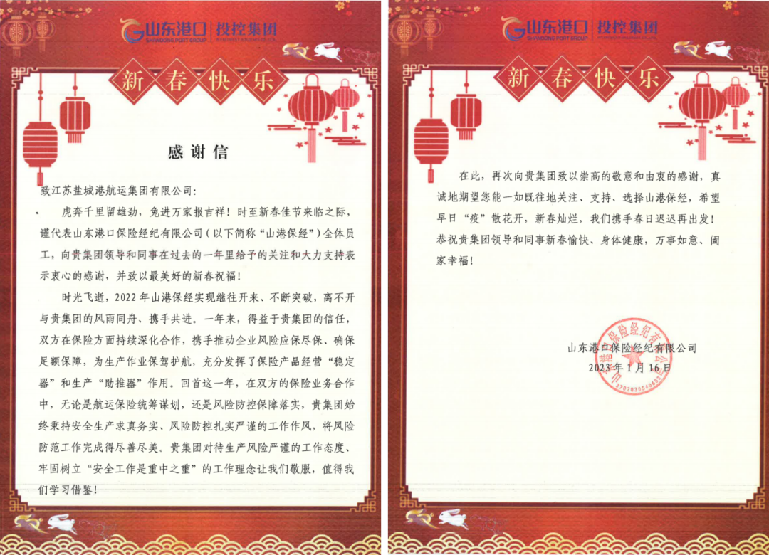 新歲序開,同赴新程。近日,集團下屬江蘇鹽城港大豐港開發集團、江蘇鹽城港港口公司、江蘇鹽城港航運集團三家單位分別收到來自山東港口保險經紀公司的感謝信。紙短情長,字字暖心。一封封感謝信,道出了鹽城港和山東港攜手發展的深厚情誼。