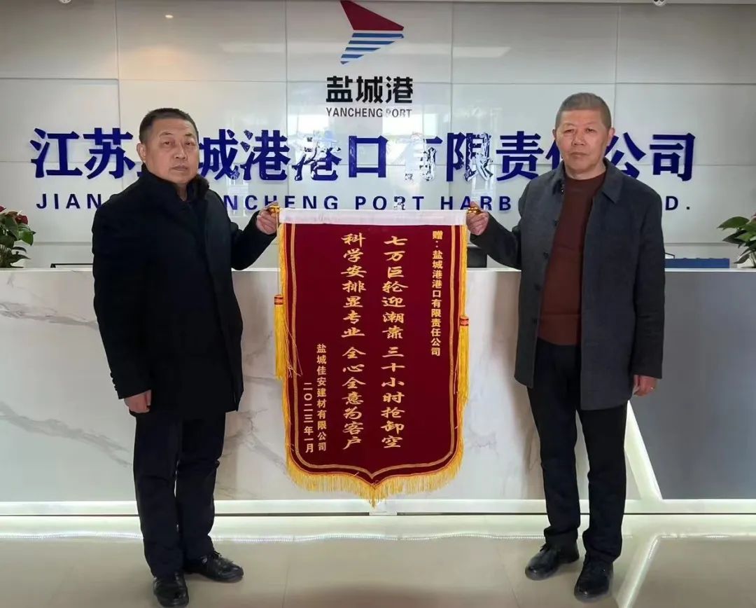 兔年伊始,鹽城港港口公司收到鹽城佳安建材有限公司贈送的錦旗,對港口公司所提供的優質裝卸服務表示感謝。