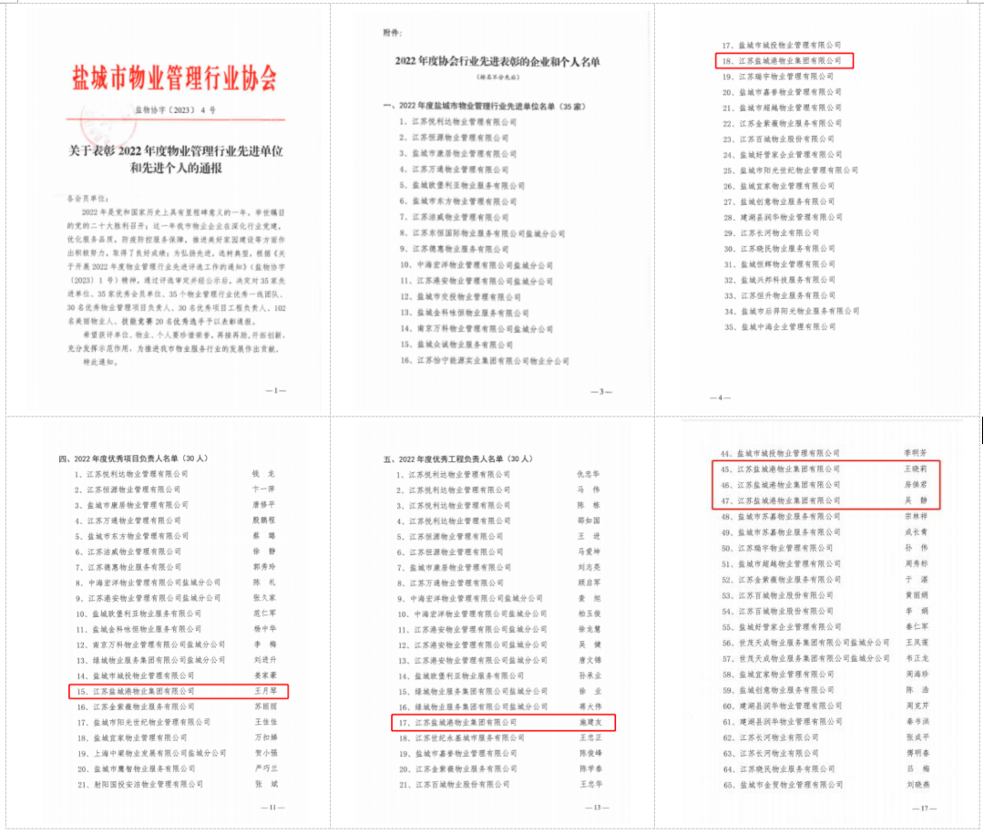 近日,鹽城市物業管理行業協會召開第三屆第四次全體會員會議,對2022年度鹽城市優秀物業企業和優秀個人進行表彰頒獎。鹽城港物業公司再度獲評“市物業管理行業先進單位”,王月琴、施建友、王曉莉、房俤君、吳靜等同志分獲“2022年度優秀項目負責人”“2022年度優秀工程負責人”“2022年度鹽城市物業管理行業美麗物業人”榮譽稱號。