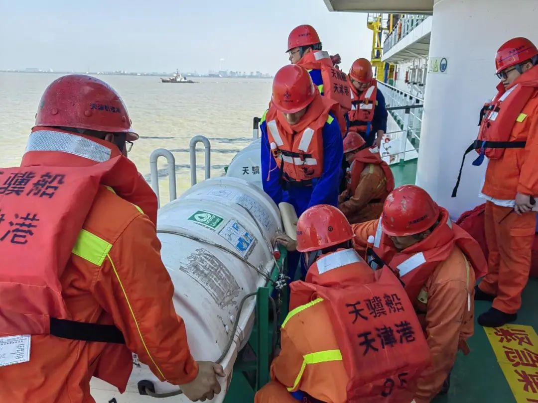 隨后,棄船演習正式開始,“棄船了!”“天驥號”船長發出棄船警報,所有船員穿好救生衣,帶好安全帽、攜帶應變部署要求器材,完成棄船前準備工作,釋放救生筏。演習過程井然有序,達到了演習的預期目標。