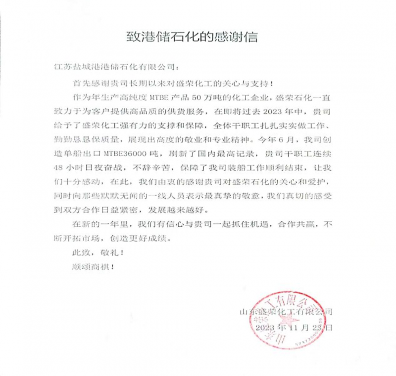 今年以來港儲石化公司全體干部職工堅持以“時間就是金錢,程序體現(xiàn)規(guī)矩,質(zhì)量鑄就精品,效率就是生命”為宗旨,不斷提升服務品質(zhì)及工作效率,獲得了客戶的贊賞與肯定。近期,合作客戶山東玉皇盛榮化工寄來一封感謝信,信中內(nèi)容充分肯定了港儲石化的服務品質(zhì),并由衷地表達了感謝。