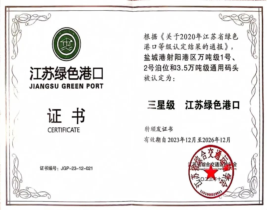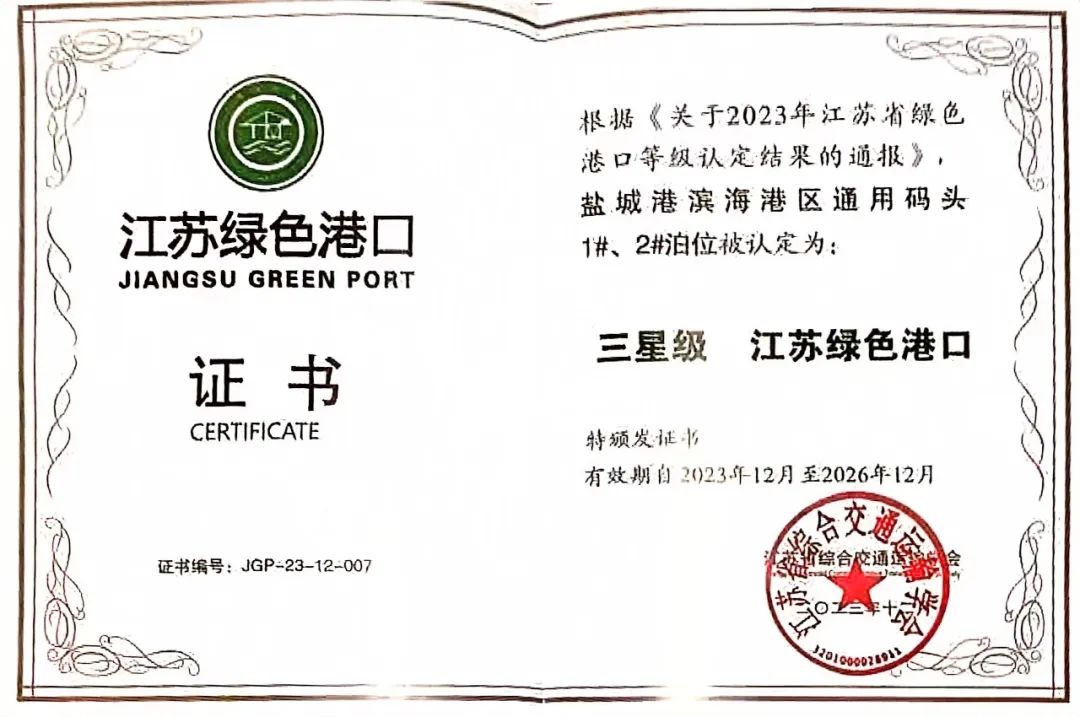 濱海港區(qū)獲得“江蘇省三星級綠色港口”榮譽(yù)稱號