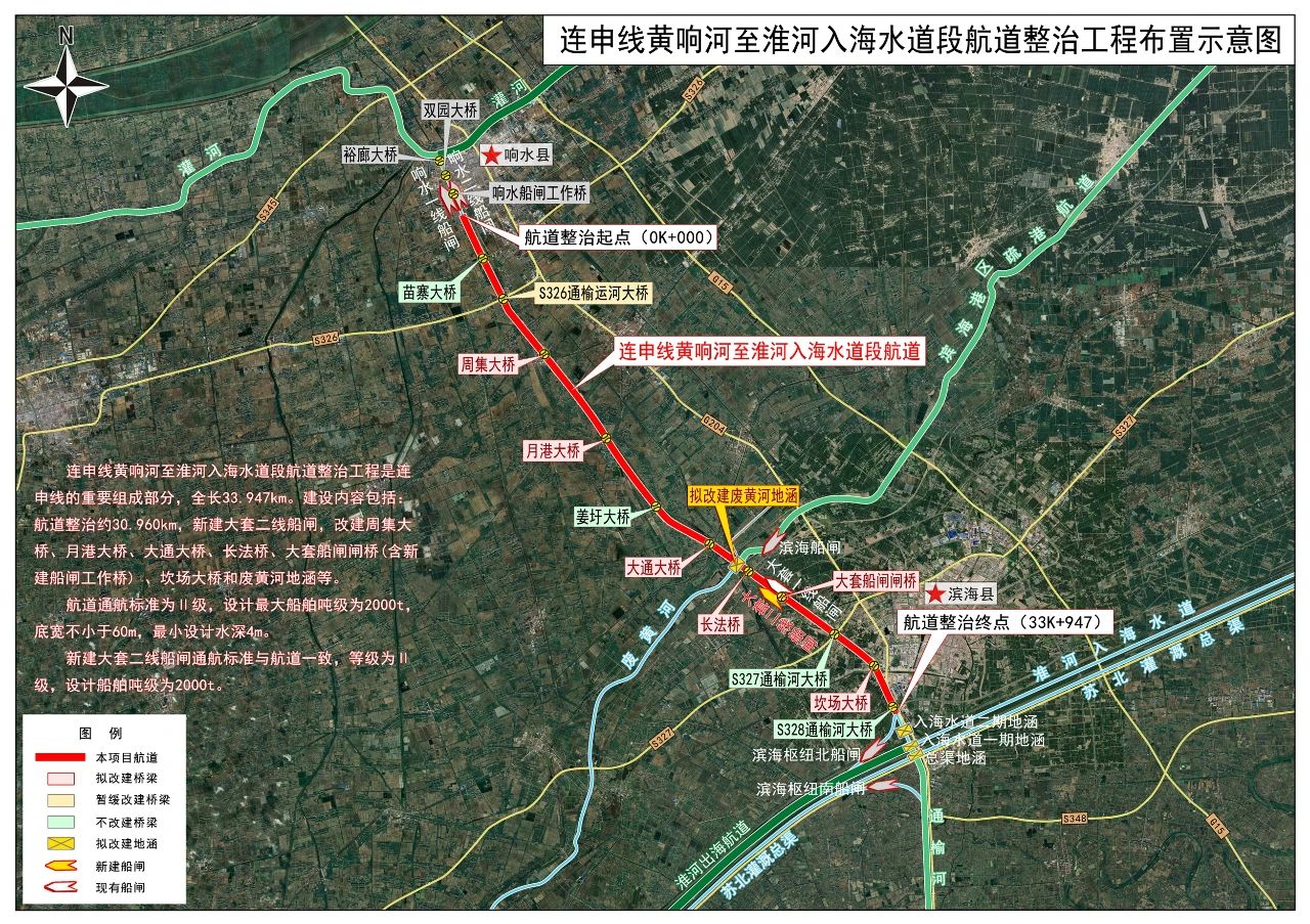 據了解,連申線黃響河至淮河入海水道段航道整治工程,起自黃響河與通榆河交匯處,訖于淮河入海水道與通榆河交匯處,全長33.95公里,整治里程30.64公里,按二級航道標準建設,設計最大船舶噸級為2000噸級,通航水深不小于4米。新建大套二線船閘1座,改建橋梁6座,原規模改建廢黃河地涵1座(含北排閘)。投資估算40.83億元,建設工期4年。