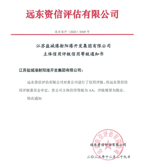 近日,遠東資信信用評級委員會審定,江蘇鹽城港射陽港開發集團有限公司成功獲得AA主體信用評級,評級展望為穩定。這是江蘇鹽城港射陽港開發集團有限公司近年來取得的又一耀眼的成績。