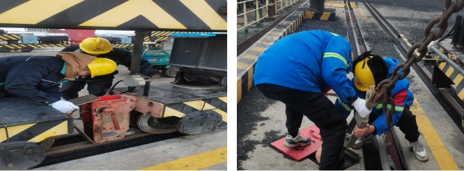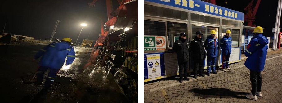 是班組長、是設(shè)備保障員,也是黨員。“我是黨員我先上”是我們每個(gè)人的行為準(zhǔn)則。寒潮來臨前,他們仔細(xì)檢查門機(jī)錨定插板、防風(fēng)拉鎖、防爬器、鐵楔是否完全插入槽內(nèi);利用加桿檢查鏈條連接環(huán)是否受力至最大值;嚴(yán)格檢測(cè)防爬器是否落地牢靠;確保惡劣天氣下港區(qū)安全有序。