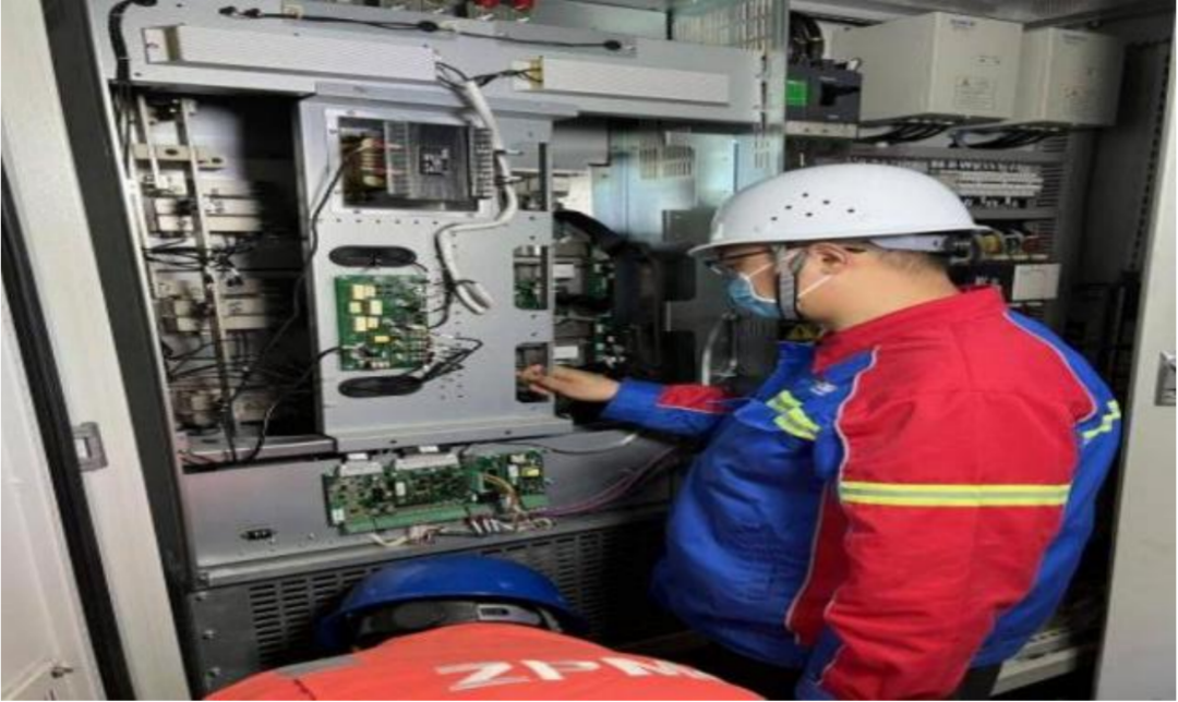 2023年5月,移機(jī)準(zhǔn)備為兩條船只靠泊時(shí),疑似一臺門機(jī)變頻器故障,控制合無法啟動(dòng)。碼頭作業(yè)人員對接售后單位,通過電話指導(dǎo)排查故障源點(diǎn)時(shí)卻遲遲找不到根源,漫長的等待時(shí)刻影響著碼頭的正常作業(yè)進(jìn)程。信息反饋至設(shè)備管理中心,“吉祥”班組經(jīng)過現(xiàn)場排查很快找到“病因”,12分鐘成功解決變頻器的故障,使之正常運(yùn)轉(zhuǎn)。