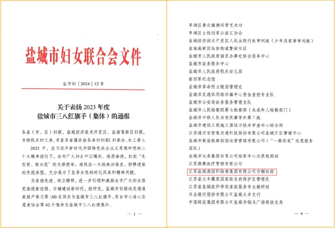近日,鹽城市婦女聯(lián)合會發(fā)布《關于表揚2023年度鹽城市三八紅旗手(集體)的通報》,江蘇鹽城港國際陸港集團有限公司巾幗班組被評為“2023年度鹽城市三八紅旗集體”。
