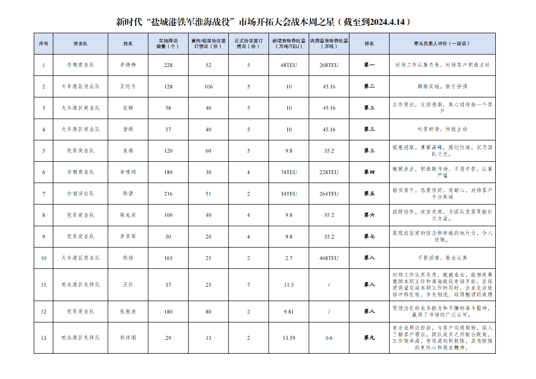 1.累計拜訪客戶數量4921家:其中大豐港區突擊隊935家,響水港區突擊隊392家,巾幗突擊隊382家,射陽港區突擊隊377家,阜寧港區突擊隊362家,多式聯運第一突擊隊352家,航運集團突擊隊339家,亭湖港區突擊隊329家,青年突擊隊324家,多式聯運第二突擊隊307家,黨員突擊隊287家,建湖港區突擊隊276家,濱海港區突擊隊259家。