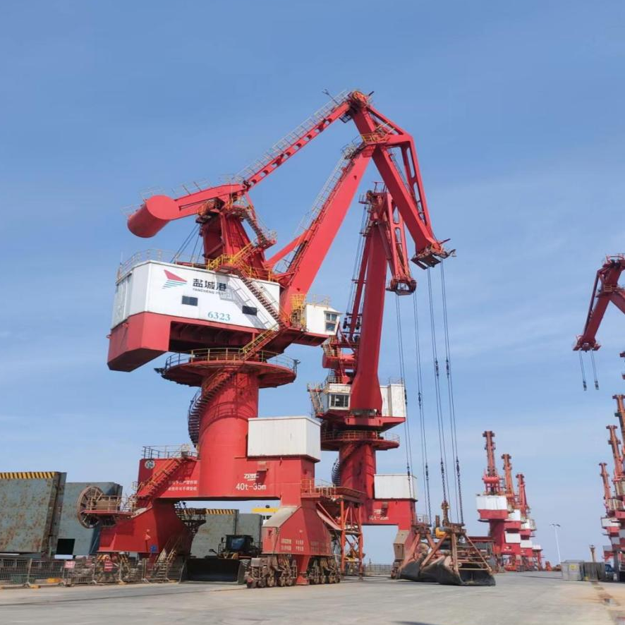 門座式起重機(jī)俗稱門機(jī),是散雜碼頭、通用碼頭最常見的卸船起重設(shè)備,也是目前鹽城港各港區(qū)最常見的起重設(shè)備。一般來說,門機(jī)負(fù)荷有10T、16T、25T、40T四類負(fù)荷,目前鹽城港門機(jī)基本在25T和40T兩種。