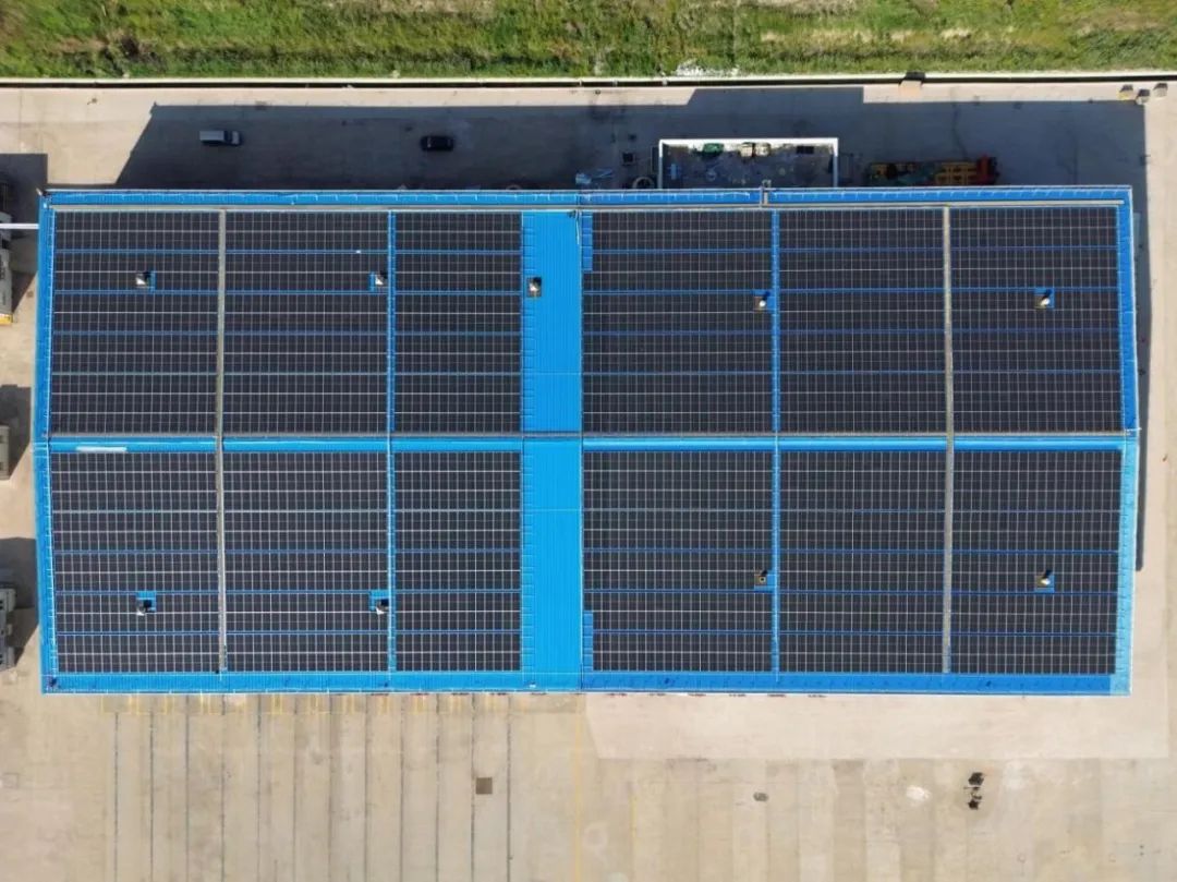 從高空俯瞰,整個屋頂被密密麻麻的光伏太陽能板覆蓋,它們在烈日下熠熠生輝,每一塊小小的光伏板都承載著巨大的綠色能量。