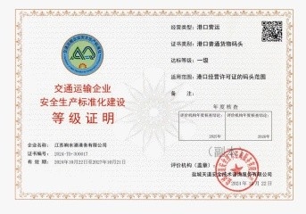 近日,鹽城港響水港區(qū)順利通過交通運(yùn)輸企業(yè)安全生產(chǎn)標(biāo)準(zhǔn)化達(dá)標(biāo)認(rèn)證考核,喜獲“交通運(yùn)輸企業(yè)安全生產(chǎn)標(biāo)準(zhǔn)化建設(shè)一級(jí)證書”。響水港區(qū)在安全生產(chǎn)管理體系精細(xì)化、規(guī)范化、標(biāo)準(zhǔn)化建設(shè)方面邁入新的發(fā)展階段,為推動(dòng)港口安全生產(chǎn)工作再上新臺(tái)階奠定了堅(jiān)實(shí)基礎(chǔ)。