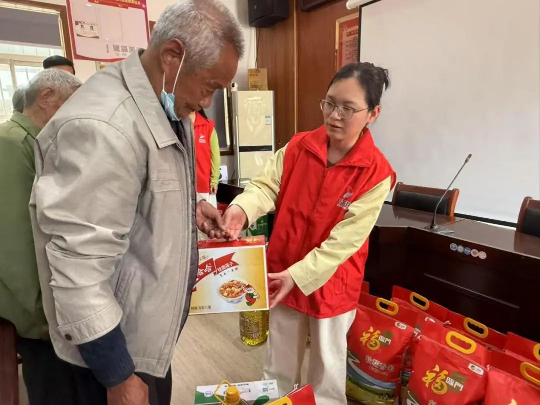 當(dāng)員工們將大米、食用油、牛奶、保暖用品等生活物資逐一遞到老人手中時(shí),現(xiàn)場(chǎng)響起了陣陣掌聲。