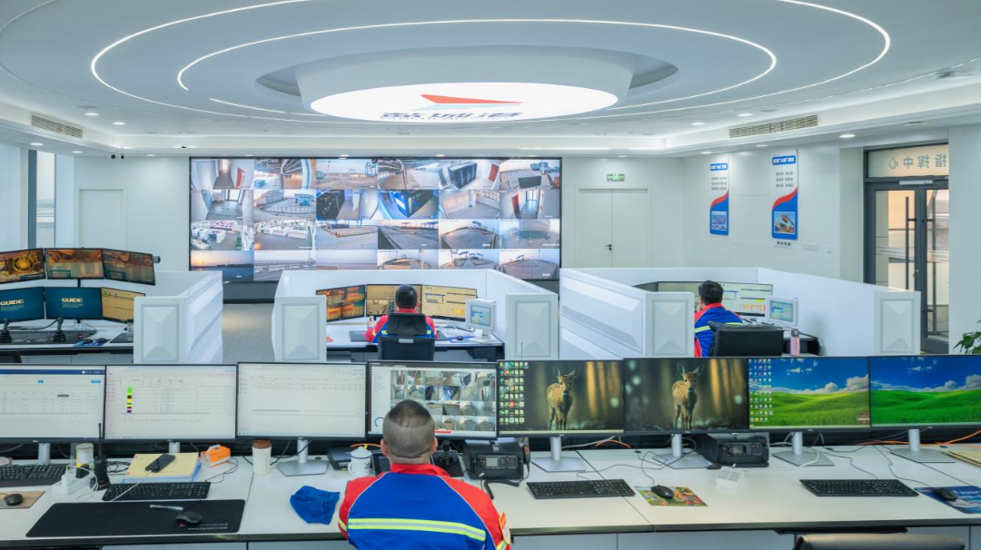 在大豐港集裝箱碼頭自動化控制中心,工作人員遠程操控著4臺自動化軌道吊,即可精準完成抓箱、落箱作業。400 畝的堆場內,除集卡司機外,不見一人值守。