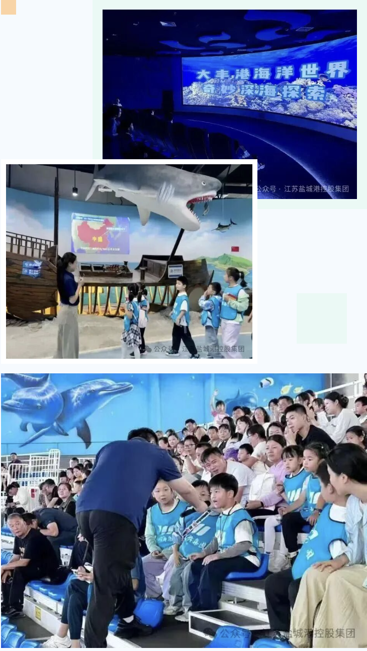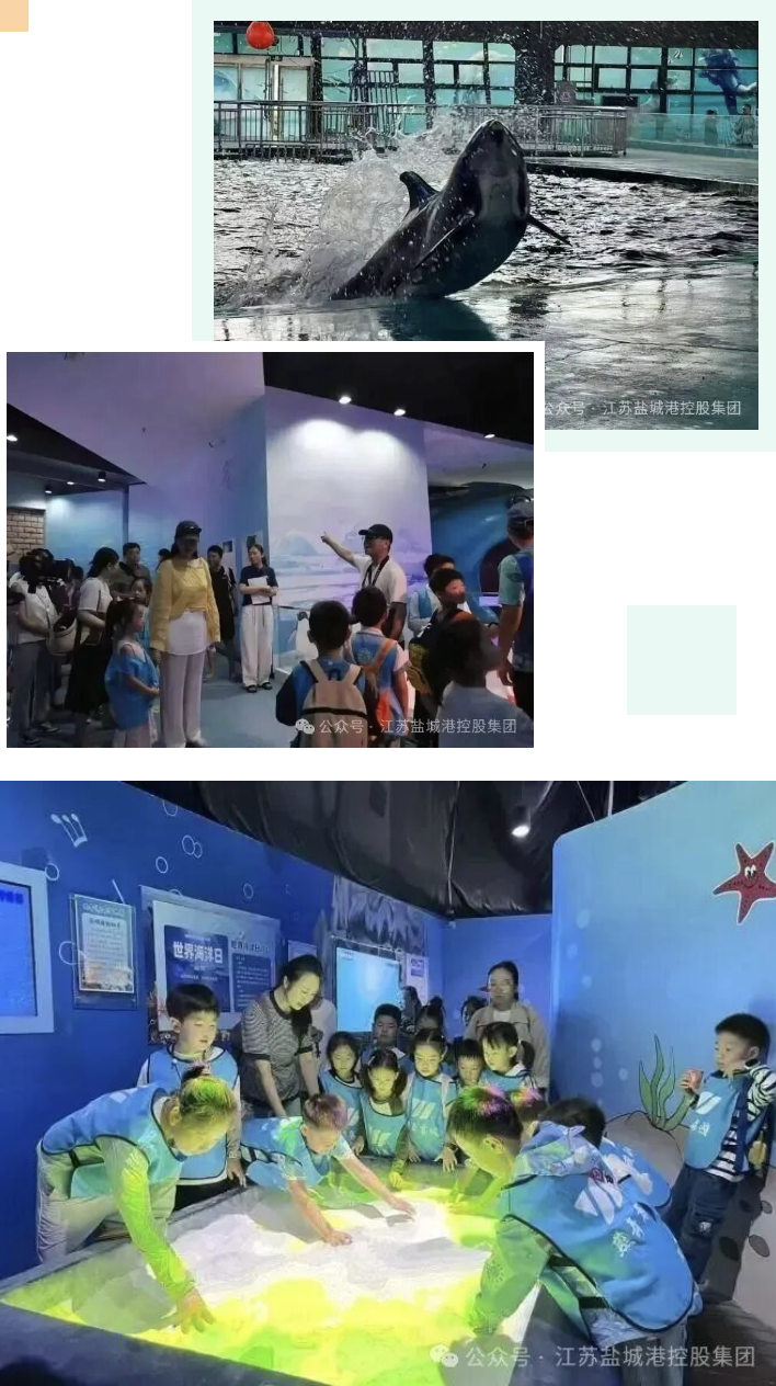 最后,孩子們踏入升級(jí)后的大豐港海洋世界科技館,沉浸式體驗(yàn)瞬間拉滿——VR實(shí)景秒變“海盜王”、5D星空影院帶你“魂穿”深海秘境。“海洋世界尋寶”活動(dòng)一開啟,孩子們化身“尋寶小達(dá)人”,歡快穿梭在場館內(nèi),“看,我找到一個(gè)”“耶!我找到兩個(gè)”,歡呼聲此起彼伏。講解員以生動(dòng)故事拆解復(fù)雜科學(xué)知識(shí),讓孩子們?cè)诨?dòng)中主動(dòng)探索,實(shí)現(xiàn)“玩中學(xué)、學(xué)中悟”。海洋劇場內(nèi),主持人進(jìn)行著海洋知識(shí)科普,訓(xùn)練員與聰明的海豚默契配合演繹著高空華爾茲,讓孩子們?cè)跉g笑聲中樹立守護(hù)藍(lán)色家園的意識(shí)。活動(dòng)尾聲,大家共同回顧全天收獲,分享難忘瞬間,為這場研學(xué)之旅畫上圓滿句號(hào)。