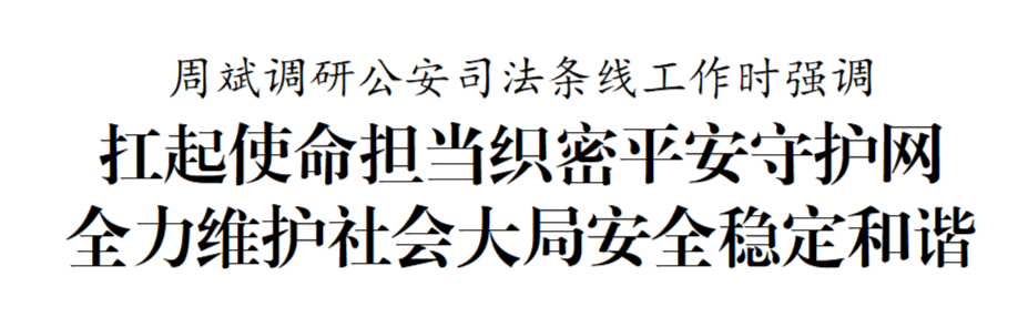 在調(diào)研中,周斌指出,公安司法條線是維護(hù)社會(huì)穩(wěn)定的“主力軍”、服務(wù)高質(zhì)量發(fā)展的“護(hù)航員”。要突出政治引領(lǐng),服務(wù)發(fā)展大局,圍繞優(yōu)化營商環(huán)境、護(hù)航產(chǎn)業(yè)發(fā)展、保障民生福祉等中心任務(wù),找準(zhǔn)工作切入點(diǎn)和發(fā)力點(diǎn),為高質(zhì)量發(fā)展提供堅(jiān)強(qiáng)法治保障。要深化社會(huì)治理,堅(jiān)持和發(fā)展新時(shí)代“楓橋經(jīng)驗(yàn)”,完善網(wǎng)格化管理、精細(xì)化服務(wù)、信息化支撐的基層治理平臺(tái),提升社會(huì)治理現(xiàn)代化水平。要堅(jiān)守人民立場(chǎng),聚焦群眾“急難愁盼”,扎實(shí)推進(jìn)平安建設(shè)、掃黑除惡、未成年人保護(hù)等工作,不斷增強(qiáng)人民群眾的獲得感、幸福感、安全感。